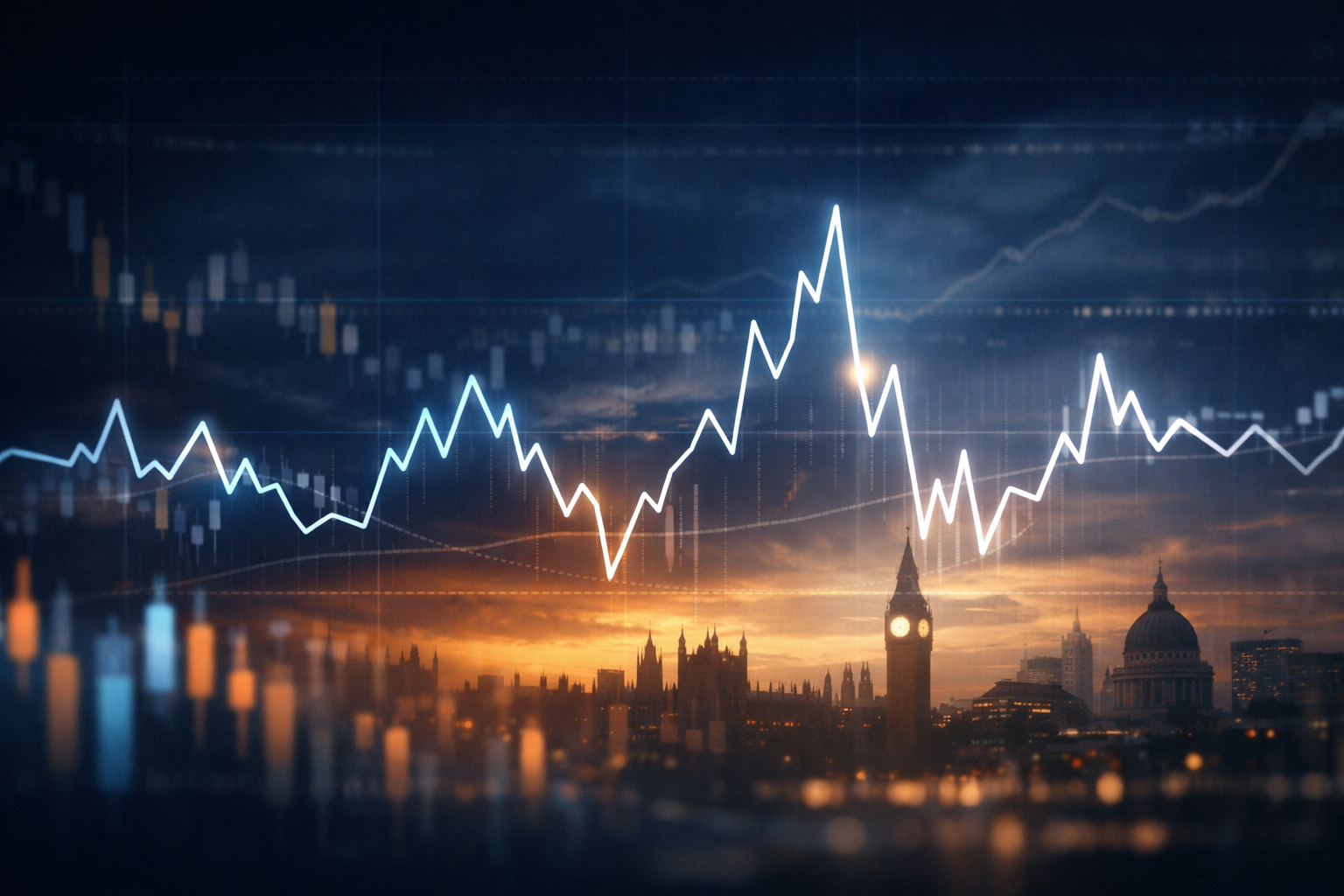 A stylised financial market chart showing a sharply fluctuating white line over a subtle London skyline backdrop at sunset. The image symbolises inflation volatility, interest rate uncertainty, and the shifting macroeconomic environment facing UK investors