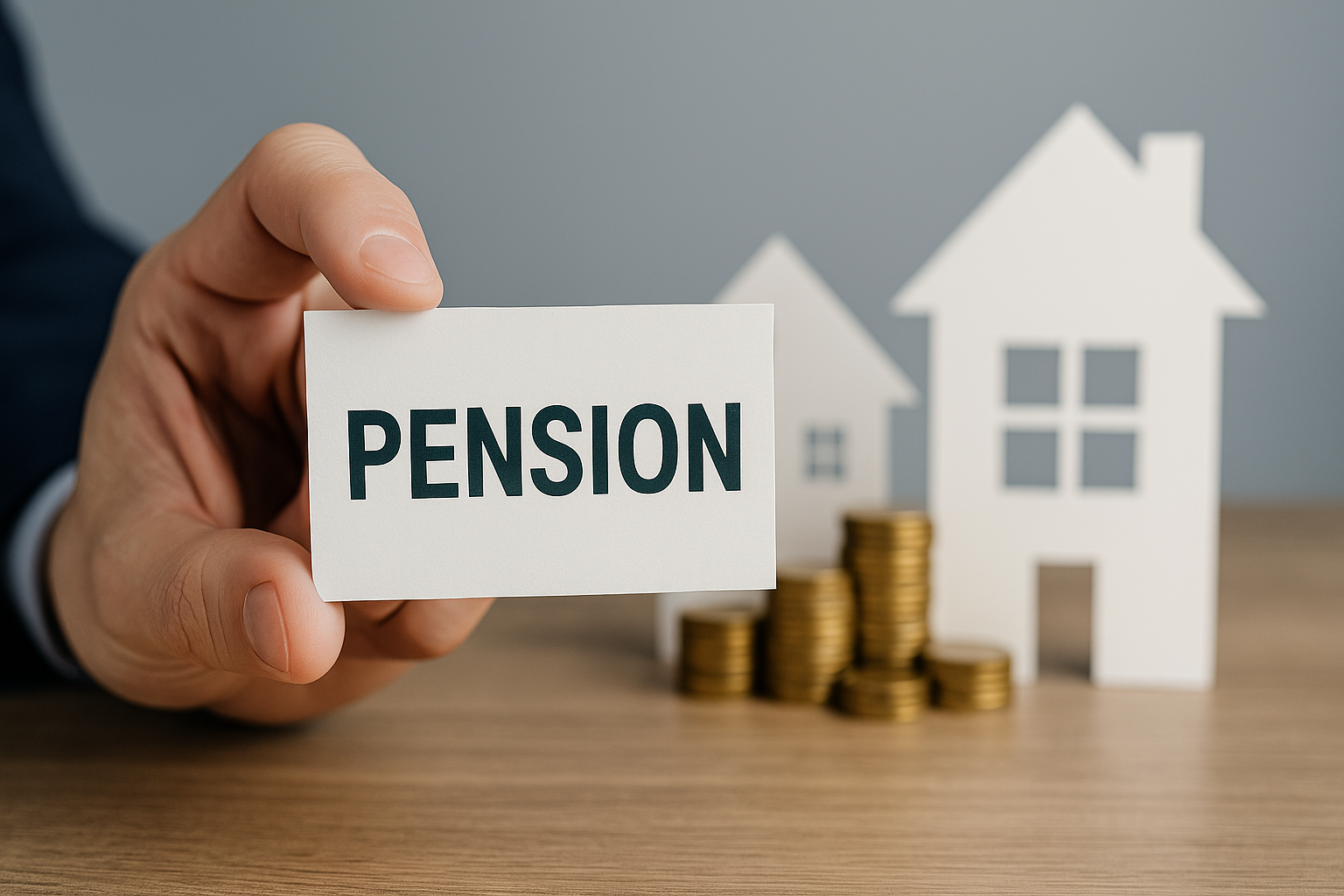 Person holding a pension card with paper house and coins in background, illustrating pension tax changes