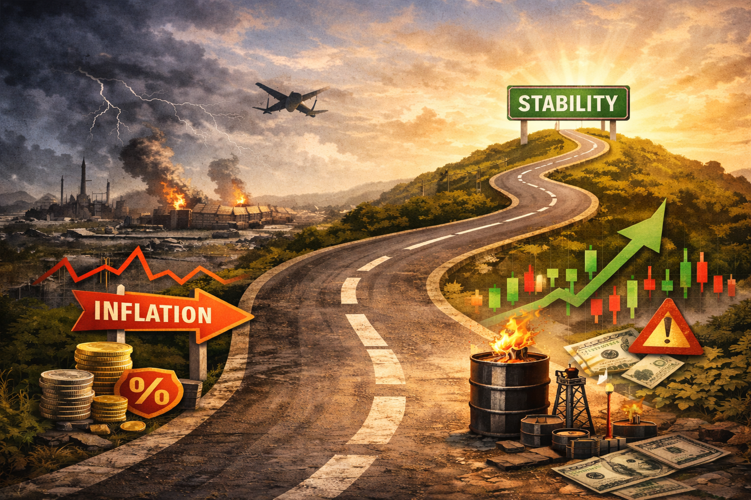 Illustration representing the “last mile” of disinflation. A winding road climbs toward a sign marked “Stability”, symbolising the path toward price stability after a period of high inflation. Around the road are financial market indicators, energy symbols, and inflation signs, reflecting the forces that can disrupt the journey. The contrast between stormy skies and emerging sunlight represents the uncertainty and volatility that often accompany the final stage of disinflation before economic conditions stabilise.