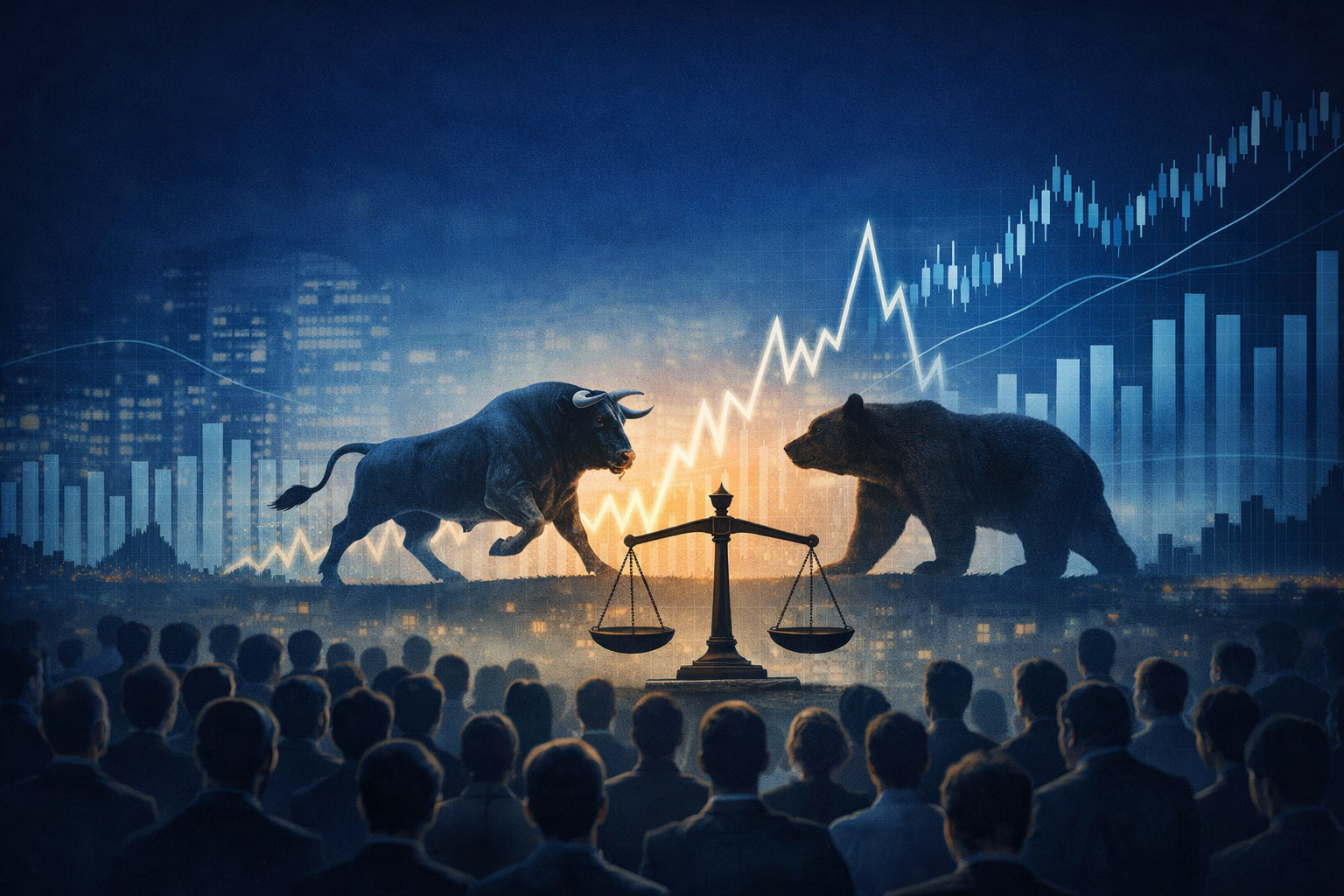 A stylised financial market scene showing a large crowd of investors observing a bull and bear confronting each other above a set of fluctuating market charts and financial data. The image reflects the idea that when passive investing dominates markets, collective investor behaviour can influence price movements and volatility.