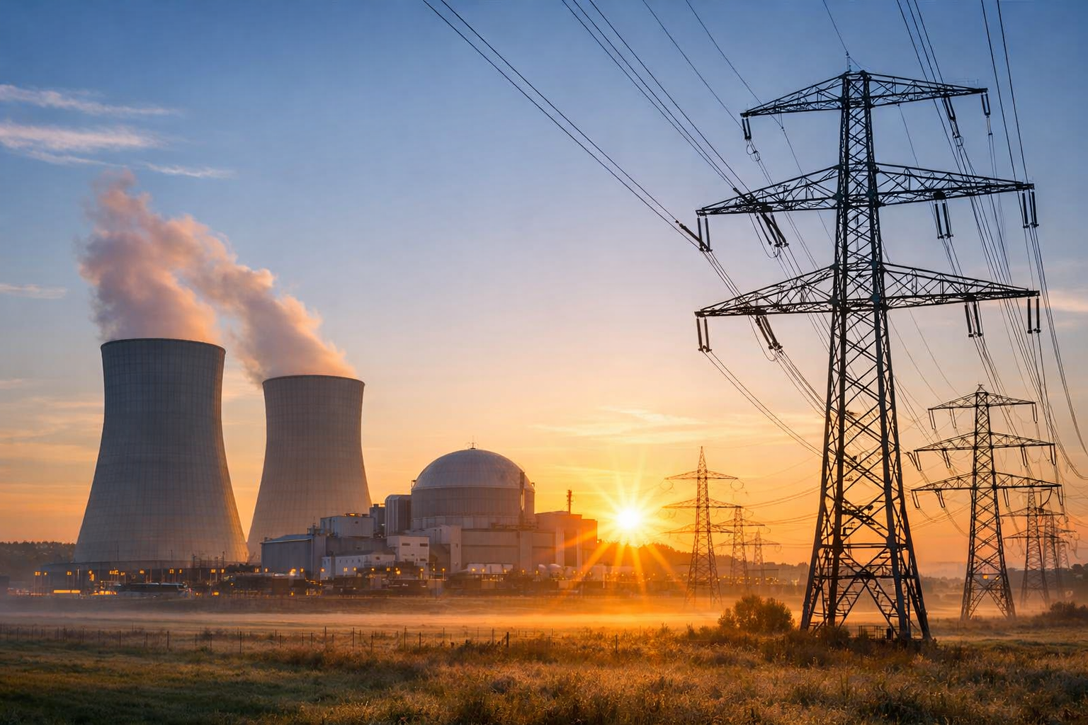 A high-resolution image of a modern nuclear power facility with cooling towers releasing steam at sunrise, set alongside high-voltage transmission lines. The scene represents the growing importance of nuclear energy, grid resilience and long-term electricity demand driven by electrification, digital infrastructure and artificial intelligence